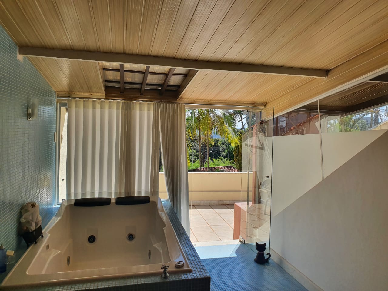 A casa tem cozinha gourmet, banheira de hidromassagem, lavanderia, sala para 2 ambientes e sala de TV, sala de jantar, cozinha no estilo americano, lareira e o projeto é do Gustavo Pena.